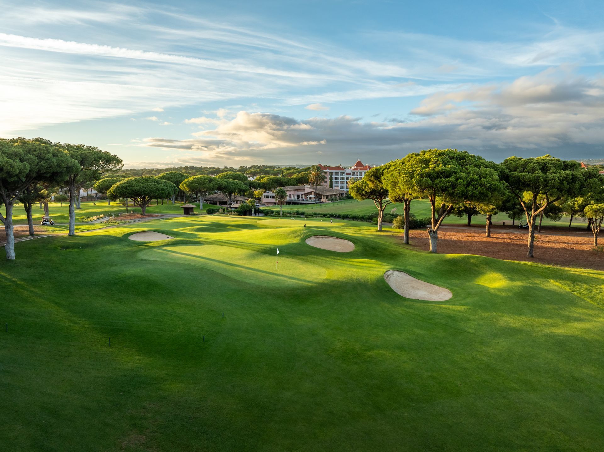 Plano e longo, com um comprimento de 6353 metros, par-72, o Pinhal possui três buracos com água frontal (4, 5 e 8) e outro (15) com uma pequena ribeira antes do green. Dos cinco campos da de Vilamoura, será aquele que exige mais estratégia. Logo no buraco 2 (par-4), existe um pinheiro solitário no meio do fairway, a dar que pensar aos jogadores na hora de decidir o shot ao green. O buraco 3 (par-5) tem um duplo dogleg e o 4 (par-4) obriga a posicionar bem a bola para depois passar por cima de um lago para chegar ao green. O mesmo lago entra em jogo no 5, um par-3 com uma entrada estreita para um green rodeado por bunkers. O buraco final é um par-4 que começa por ser a subir antes de descer para o green, já próximo da clubhouse.